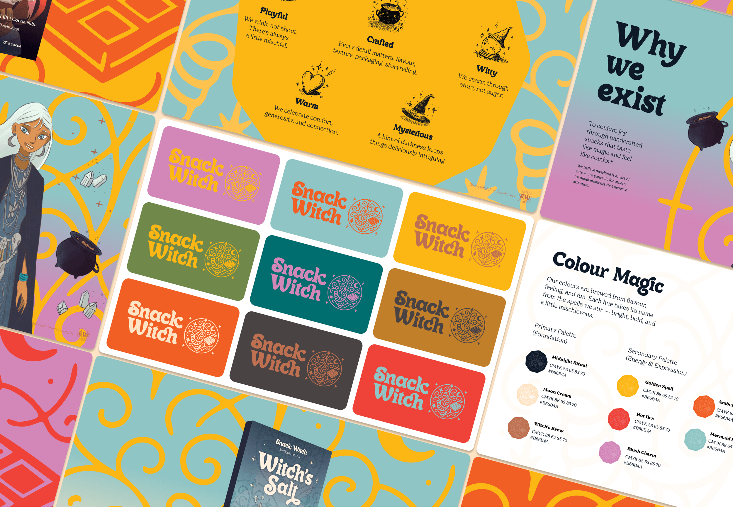 The brand balances dark whimsy and bright fun. Visually, it mixes mystical motifs (cauldrons, moons, charms) with bold, flavour-inspired colour palettes. The tone is cheeky and confident, a wink to witchcraft without taking itself too seriously.